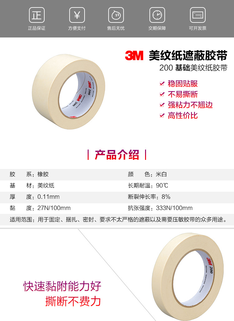 內(nèi)容描述:3M 200基礎(chǔ)美紋紙膠帶,穩(wěn)固貼服,撕斷不費(fèi)力,強(qiáng)粘力不翹邊,高性價(jià)比,用于捆軋,固定,密封,要求不太嚴(yán)格的遮蔽等眾多用途。
