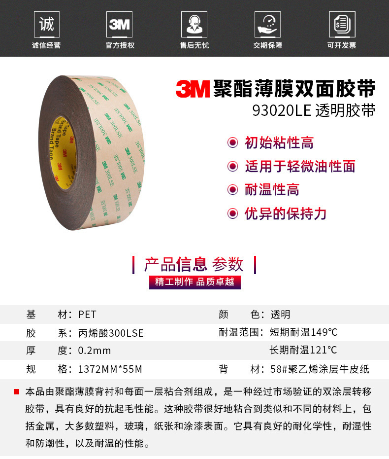 內容描述:3M93020LE 0.2mm厚,PET基材雙面膠帶, 300LSE系列,透明超薄,這種膠帶很好的粘合類似和不同材料表面,包括金屬,大多數塑料,玻璃,紙張和涂漆表面。它具有良好的耐化學性,耐濕,耐溫,耐候性和防潮性。 優質服務:如果您對我公司及我們的產品感興趣,歡迎到我公司來拜訪,您也可以以來電咨詢,我們的員工將竭誠為您提供產品信息和應用知識,使您不僅得到物超所值的新產品而且得到我們貼心的服務。