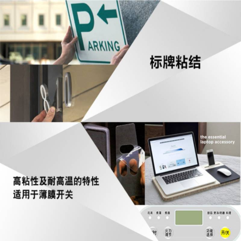 ,金屬/聚酯罩薄膜開關及泡棉的粘接。其耐高溫產品還可以固定回流焊過程中的柔性線路板。
