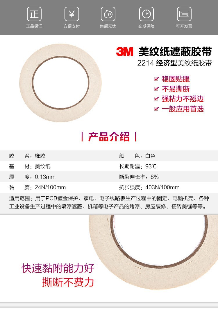 內容描述:3M? 2214遮蔽膠帶是一款頗具成本效益的、以皺紋紙作為底襯的膠帶,能用于固定、捆綁、密封以及其他需要壓敏帶的非關鍵性纏繞工作。膠帶卷展開操作便于控制,用手即可輕松撕下。 優質服務:如果您對我公司及我們的產品感興趣,歡迎到我公司來拜訪,您也可以以來電咨詢,我們的員工將竭誠為您提供產品信息和應用知識,使您不僅得到物超所值的新產品而且得到我們貼心的服務。